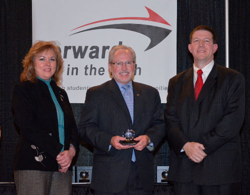 Jim Tackett, right, executive director of Forward in the Fifth, and Dr. Dessie Bowling, left, board chairman, present Bob Hutchison of Paintsville with the 2013 Appalachian Leaders in Education (AppLE) Award in the community leader category. Hutchison, a business leader, was presented the award at Forward in the Fifth’s Education Leadership Day and regional AppLE Awards recognition program on Monday, May 13, at The Center for Rural Development in Somerset.